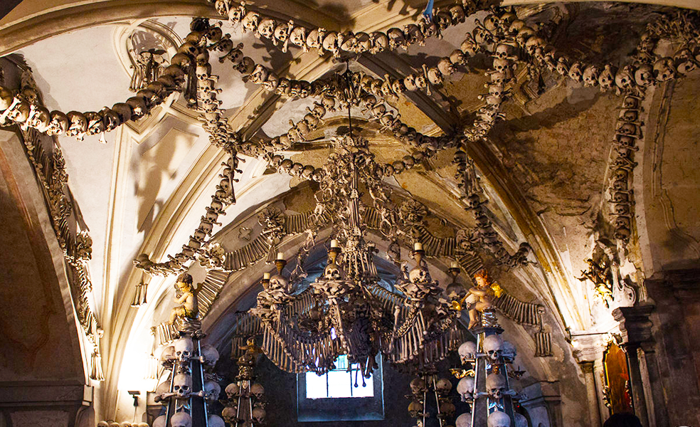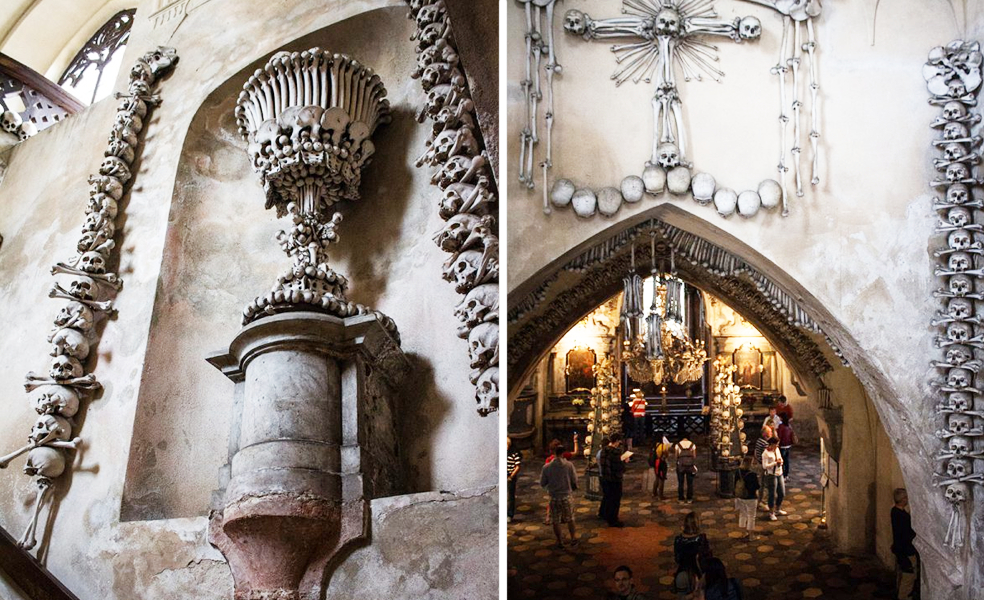 მაგრამ ტაძრის შიდა ინტერიერი საოცარია. შენობის კუთხეებში არის ძვლების დიდი რაოდენობა მოთავსებული, რომელთაც უზარმაზარი ზარის ფორმა აქვს. ასევე ძვლებით არის გაფორმებული თაღები, ჭერი, ჩირაღდნები და ვაზებიც კი.