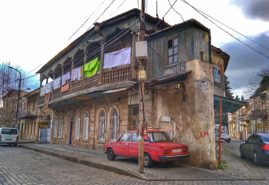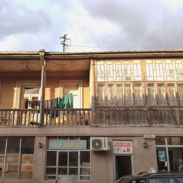 ფოტოზე: სახლი მე-19 საუკუნის ქუთაისიდან იმ დროისათვის ტრადიციული ქალაქური არქიტექტურის ნიმუშია - ქვედა სართული ქვის, ზედა - ხის. ხისავე ჩუქურთმებიანი აივნით.