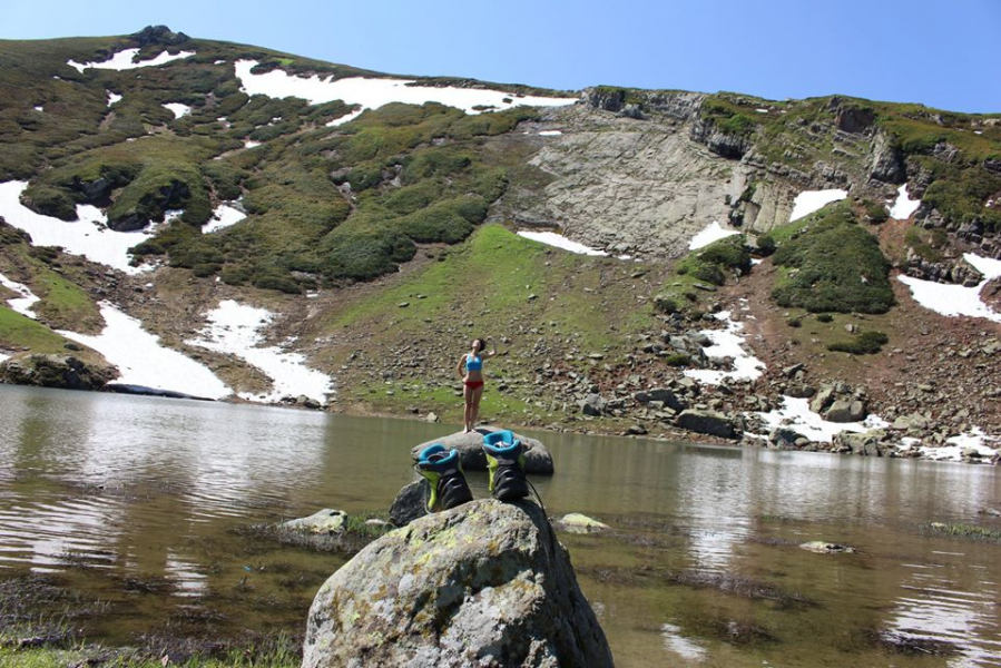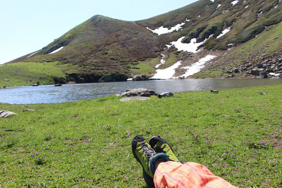 ლამის ყველა მხრიდან ბორცვებითაა შემოსაზღვრული. ზედ სანამ არ მიადგები შეუძლებელია დაინახო. ღრმა არა მაგრამ გამდინარე და სუფთა. მზე უკვე საათზე მეტი იყო კისერს გვიწვავდა. შანსი ხელიდან არ გავუშვით ჩანთები მხრებს დავხსენით და შევტანტალდით...შეტანტალება ცოტა ხმამაღალი სიტყვაა. ისეთ ცივი იყო სახის ყველა მივიწყებული კუნთი გავაღვიძე მანჭვის მიმიკებით. დიდხანს ვერ გავძელით, მალევე იქვე მზისგან გახურებულ ქვის ლოდზე გავწექით და ცხოვრებით ტკბობა დავიწყეთ. ქალაქს ბუღი ასდის, აქ კი ჯერ კიდევ თოვლებთან პრანჭვით ვბანაობთ...როგორც წინა პოსტიდან იცით, ბევრი სანოვაგე არ გვქონდა თან მაგრამ სურამის ნაზუქები გვეშოვებოდა...გავტეხეთ და ტბის ხედით დამკბრებმა კუჭის საკითხიც მოვაგვარეთ.