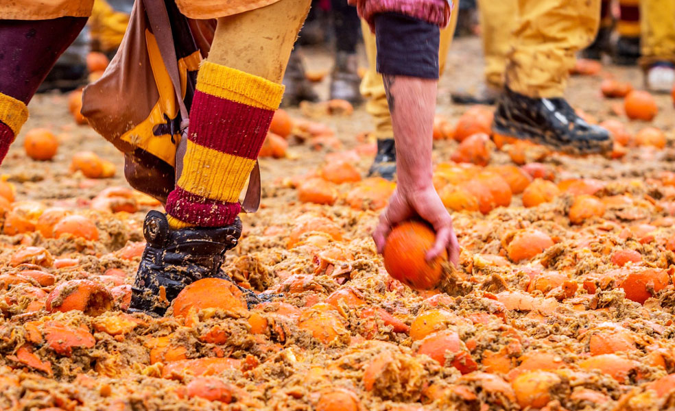 22-25 თებერვალს იტალიის ერთ-ერთ ქალაქში ივრეაში იმართება ე.წ. ბრძოლა ფორთოხლით. შუასაუკუნეების ტანსაცმელში გადაცმული ფესტივალის მონაწილეები ერთმანეთს ფორთოხლებს ესვრიან. ეს ჩვეულებრივი ხალხის ფეოდალებთან ბრძოლის თავისებური სიმბოლოა.