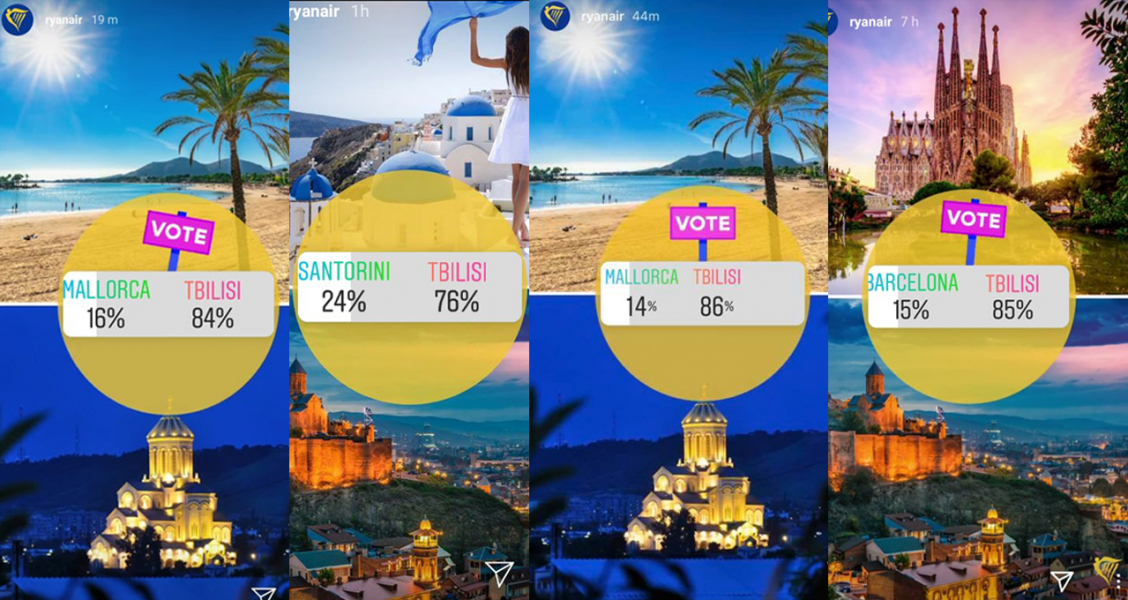 როგორც ყველამ უკვე შევამჩნიეთ ბოლო რამდენიმე დღეა საერთაშორისო ავიაკომპანია რაინეარი (Ryanair) ინსტაგრამ სთორიში ატარებს გამოკითხვას: „სად გსურთ გამგზავრება 2020 წელს“ და ირჩევს ამ წლის საუკეთესო და ყველაზე მოთხოვნად მიმართულებას.